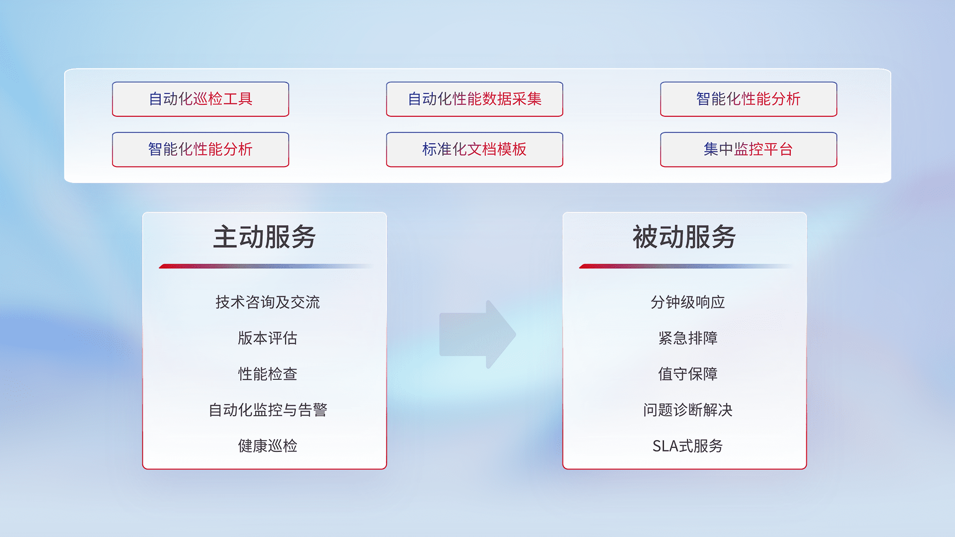 智能化工具和标准化文档,,,,保障服务质量,,,,提供主动服务(包含技术咨询、、、版本评估、、性能检查、、、、自动化监控与告警、、健康巡检)和被动服务包含(分钟级响应、、、紧急排障、、、值守保障、、、、问题诊断解决、、、SLA服务)。。。