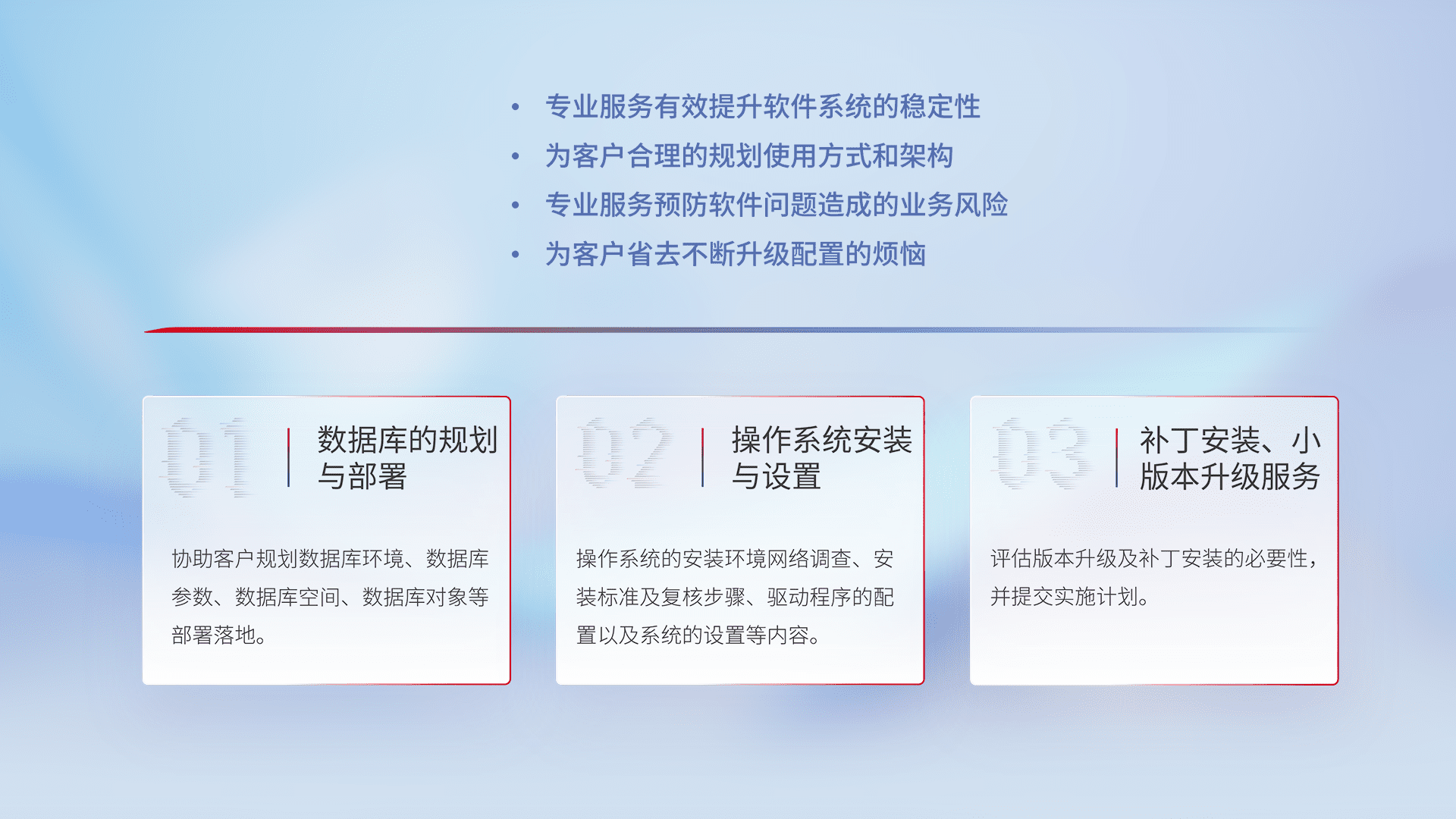 为客户提供软件规模升级、、、快速部署、、、、按需配置的专业服务,,从数据库的规划与部署到操作系统的安装与设置,,再到补丁安装和小版本升级提供支持。。。